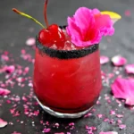 Serve this cocktail cold and fresh. Use a tall clear glass to show off the bright pink color. Chill your glass in the fridge or freezer first if you like. After you rim the glass with black sprinkles, add ice so the drink stays cold. Drop a lime wedge on the rim and add a cherry on a pick to make the drink look festive.