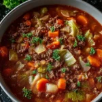 A warm and filling soup featuring ground beef, cabbage, and vegetables in a light beef broth, perfect for cold days or busy weeknights.