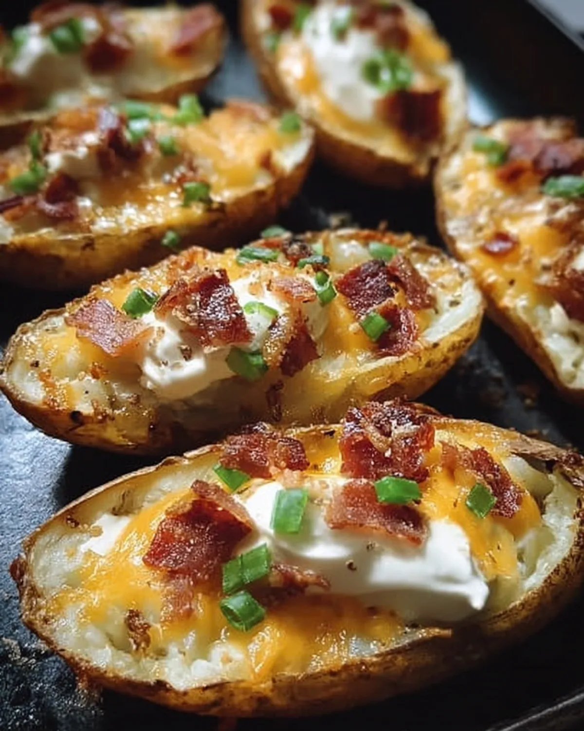 Delightful appetizer featuring crispy potato skins loaded with melted cheese and crumbled bacon, perfect for gatherings.