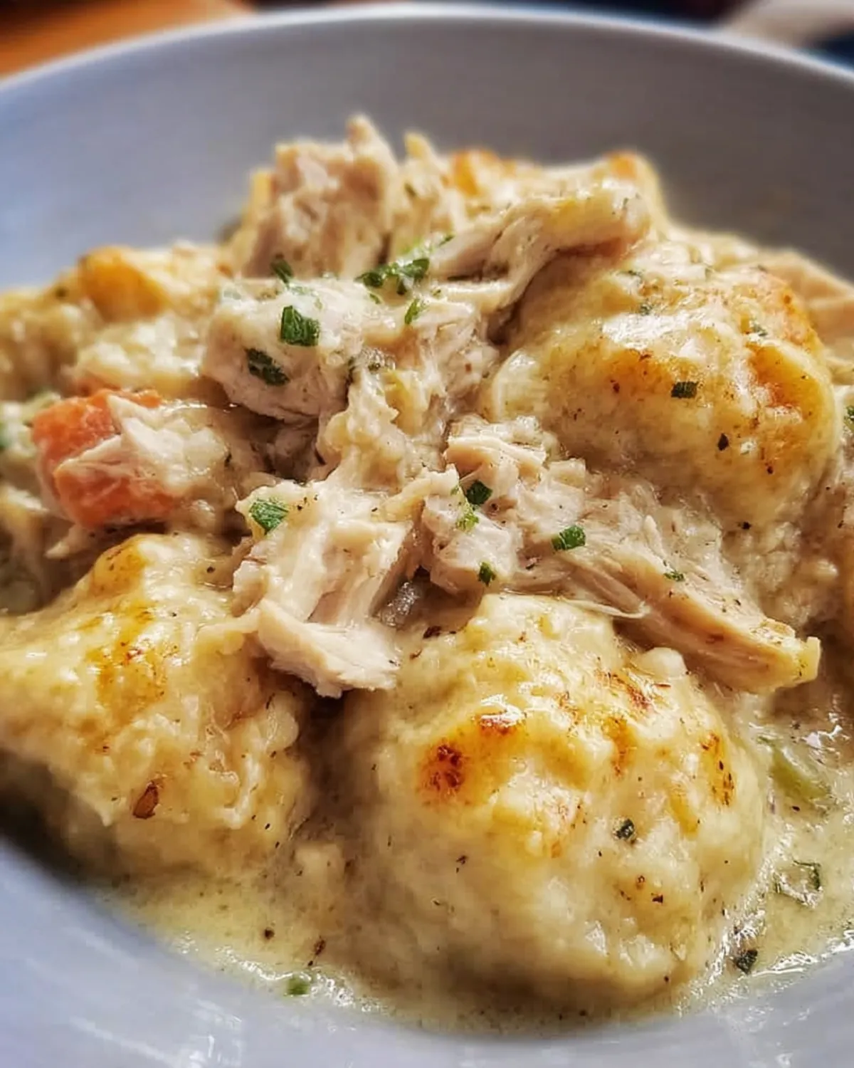 A hearty and comforting casserole made with tender chicken, fluffy dumplings, and a creamy sauce, perfect for families and gatherings.
