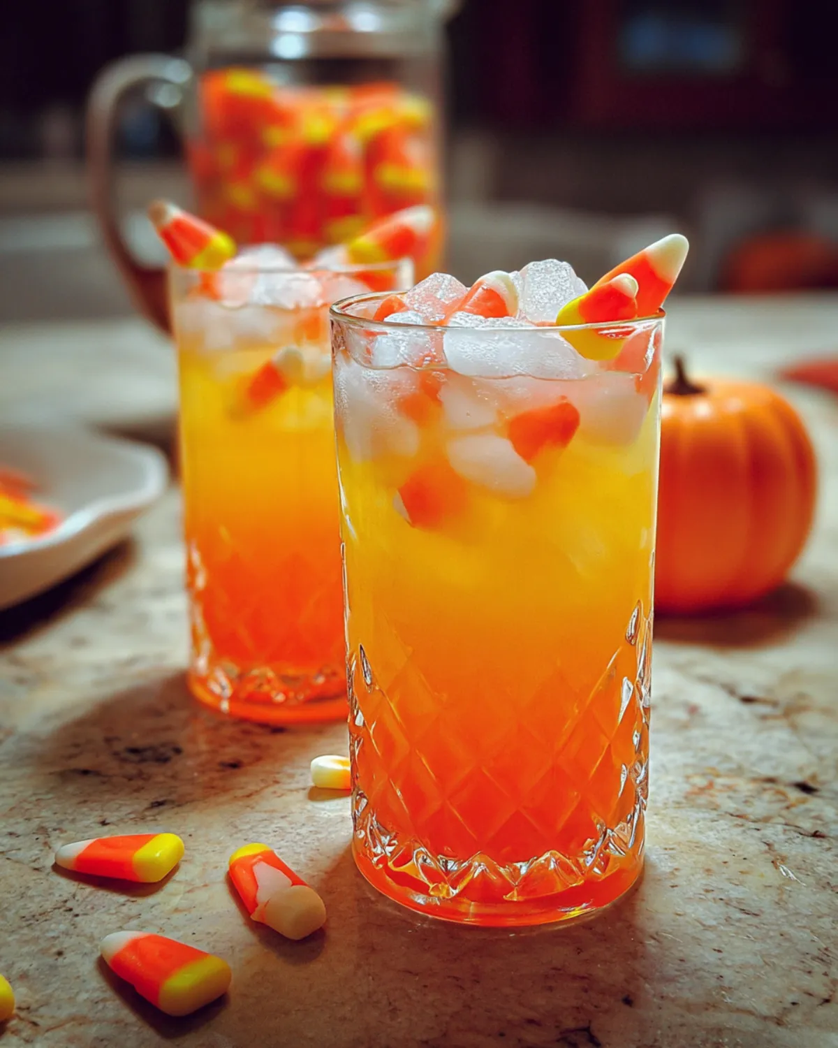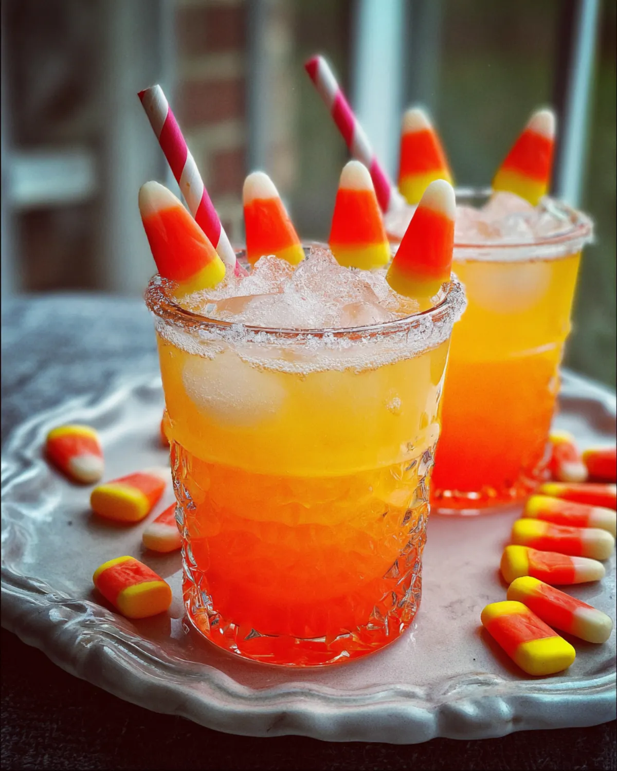 A cheerful and festive mocktail that captures the sweet flavors and bright colors of candy corn, perfect for Halloween and fall celebrations.
