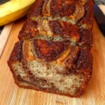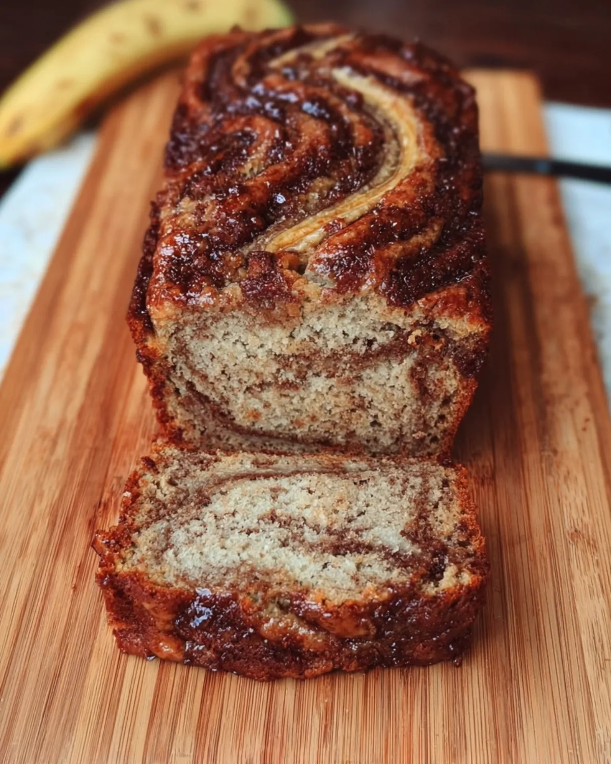 A delightful banana bread with swirls of cinnamon sugar, perfect for breakfast, snacks, or dessert.