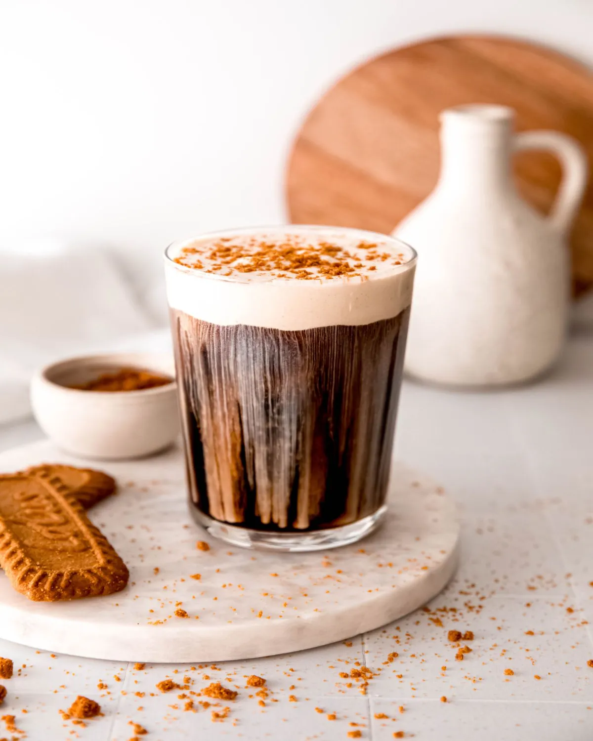 A refreshing cold brew coffee drink infused with the delightful sweetness of cookie butter, perfect for any time of the day.