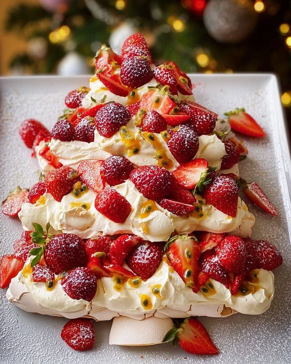 - Carefully assemble the pavlova tree by layering the meringue pieces and topping with whipped cream, strawberries, and passionfruit. Serve and enjoy your elegant dessert!