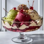 A delicious layered Italian dessert typically featuring pistachio, cherry, and chocolate or vanilla ice cream, garnished with nuts and fruits.
