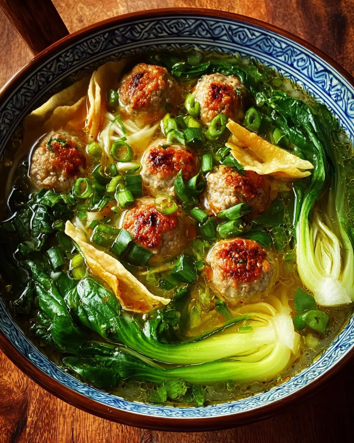 A warm and comforting soup featuring flavorful ground chicken meatballs with ginger and garlic, fresh baby bok choy, and crispy wonton strips, perfect for chilly days.
