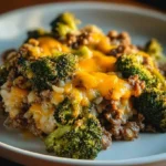 A warm and simple one-dish meal featuring ground beef, tender broccoli, rice, and melted cheese, baked to golden perfection.