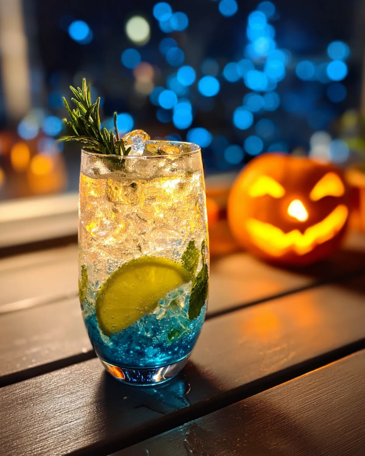 The Boo Moon is a delightful and colorful drink combining blue sports drink, raspberry syrup, peppermint syrup, and ginger beer, topped with silver edible shimmer for a magical appearance.