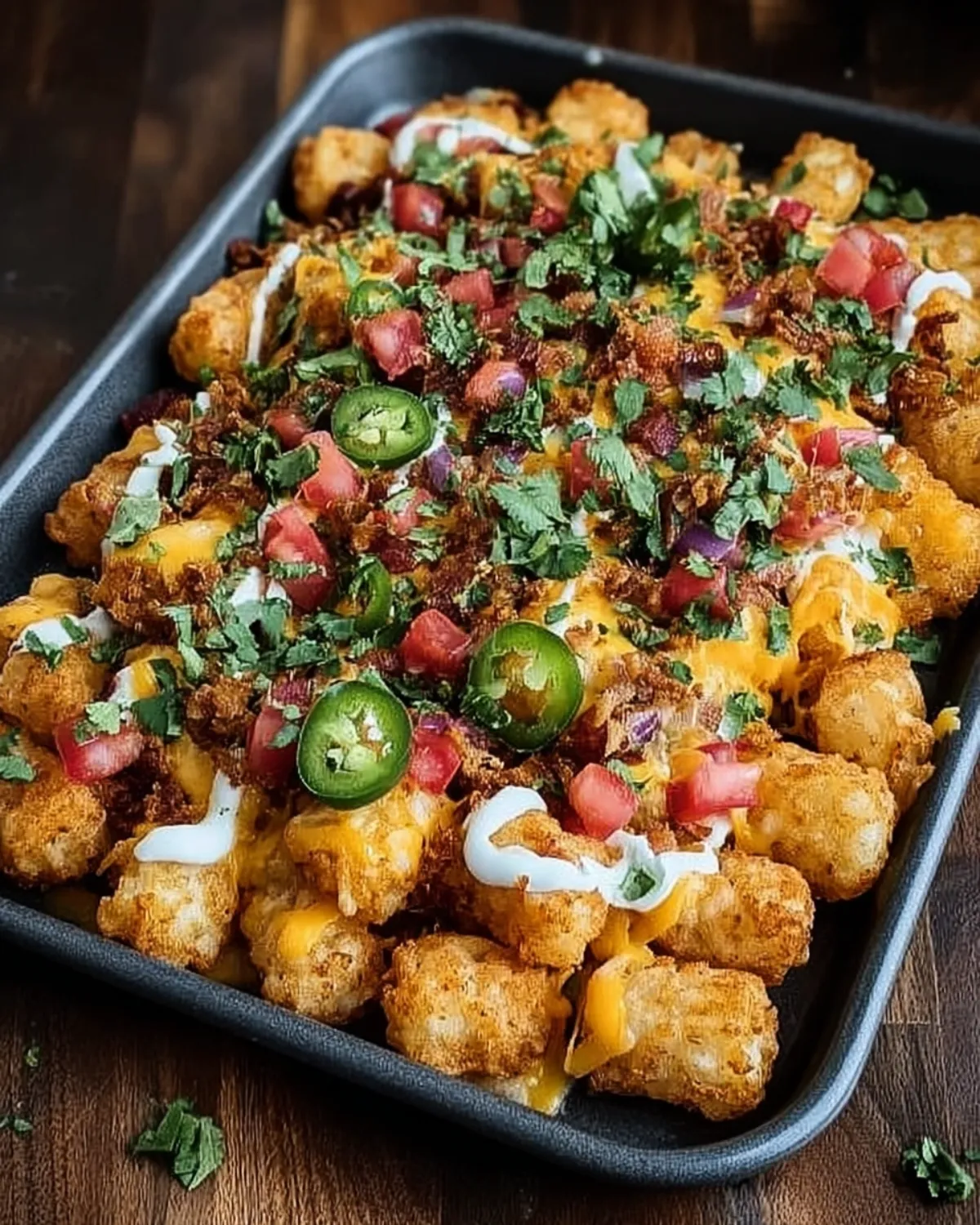 A delicious twist on traditional nachos using crispy tater tots topped with creamy cheese, fresh vegetables, and savory spices.
