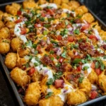 Loaded Tater Tot Nachos are a delicious twist on traditional nachos. Instead of using tortilla chips, this recipe uses crispy tater tots as the base. It is topped with creamy cheese, fresh vegetables, and savory spices. This meal or snack is easy to make and perfect for sharing.