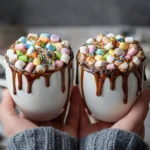 A delightful and colorful cocoa drink perfect for all ages, combining rich chocolate with vibrant marshmallows.