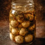 - Pack the Jar: In a clean glass jar, pack the mushrooms tightly and add garlic, mustard seeds, red pepper flakes, peppercorns, and herbs.