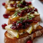 Delightful crostini topped with creamy brie, fresh pears, tart cranberry sauce, and drizzled with thyme-infused honey.