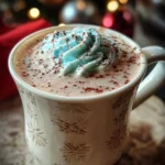 A delightful cup of warm cocoa blending creamy milk, rich white chocolate, and a hint of peppermint, perfect for festive winter nights.