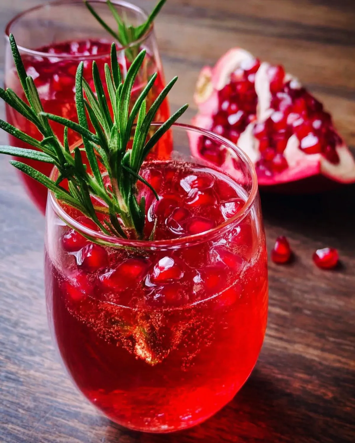 A refreshing drink combining the tart sweetness of pomegranate juice with earthy notes of rosemary, perfect for any occasion.