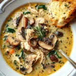 A comforting and creamy soup featuring shredded rotisserie chicken and earthy mushrooms, perfect for any season.