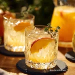 A refreshing non-alcoholic drink made with fresh peaches, fragrant thyme, and sparkling juices, perfect for any occasion.