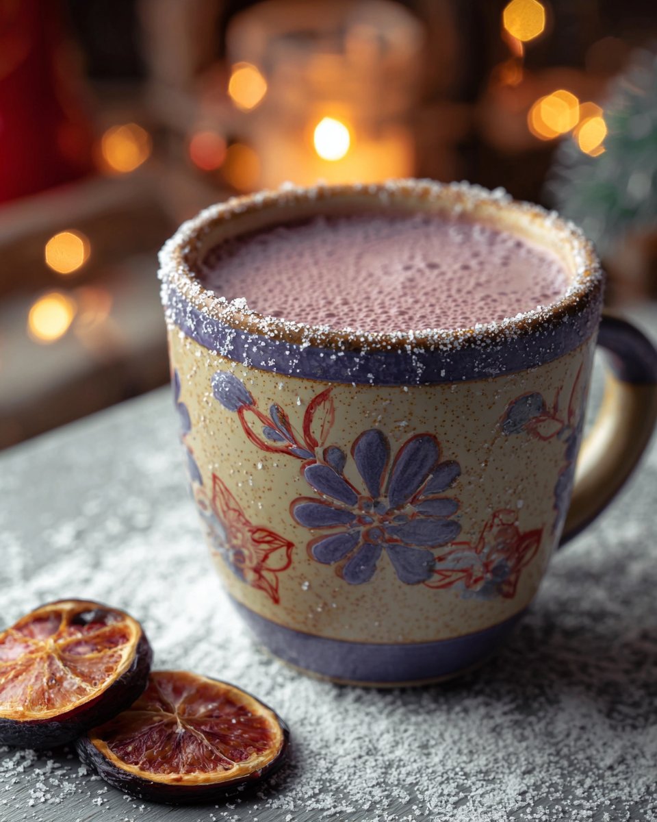 - Serve: Pour the Sugar Plum Cozy Cocoa into a mug. If desired, top it with sugared plums and colorful sprinkles for a festive touch.