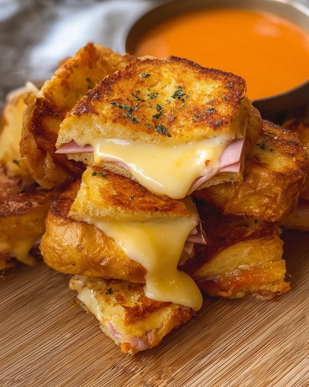 These mini grilled cheese sandwiches are best served hot, with options for dipping in tomato soup or marinara.
