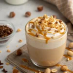 A delightful drink combining espresso, hazelnut milk, and toffee syrup, topped with whipped cream and hazelnut pieces.
