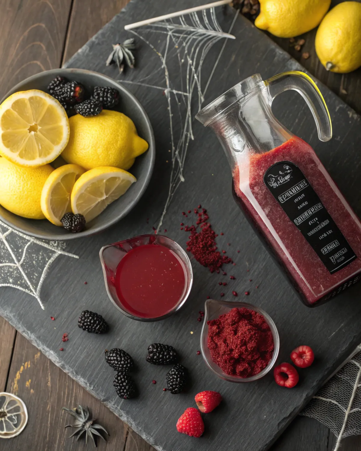 A dramatic Halloween mocktail combining tart lemon, cranberry, and blackberry flavors, perfect for spooky celebrations.