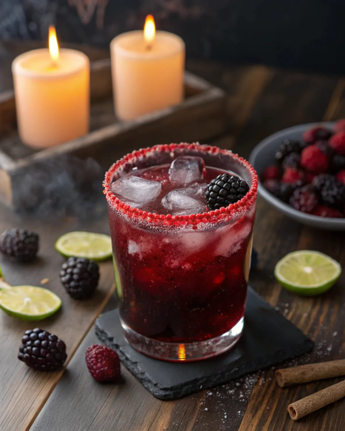 The theatrical presentation elevates this from simple lemonade to party centerpiece. The red sugar rim catches the light beautifully, while the “blood moon” effect from frozen blackberries creates an enchanting visual as they slowly defrost and release their dark juices into the drink.