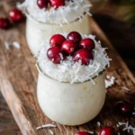 - Fill the glasses with the punch and garnish with cranberries and more coconut.
